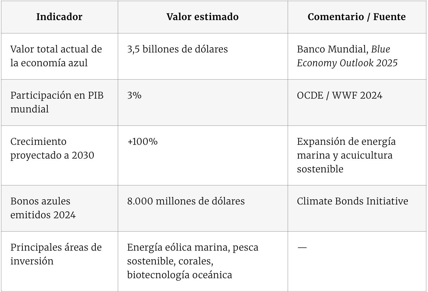 Según datos de la OCDE, la economía azul global representa ya alrededor del 3% del PIB mundial, con expectativas de duplicar su tamaño para 2030. El informe Blue Economy Outlook 2025 del Banco Mundial estima que el valor de las actividades sostenibles vinculadas al mar alcanzará los 3,5 billones de dólares, impulsadas por la expansión de la energía eólica marina, la biotecnología oceánica y la pesca certificada.