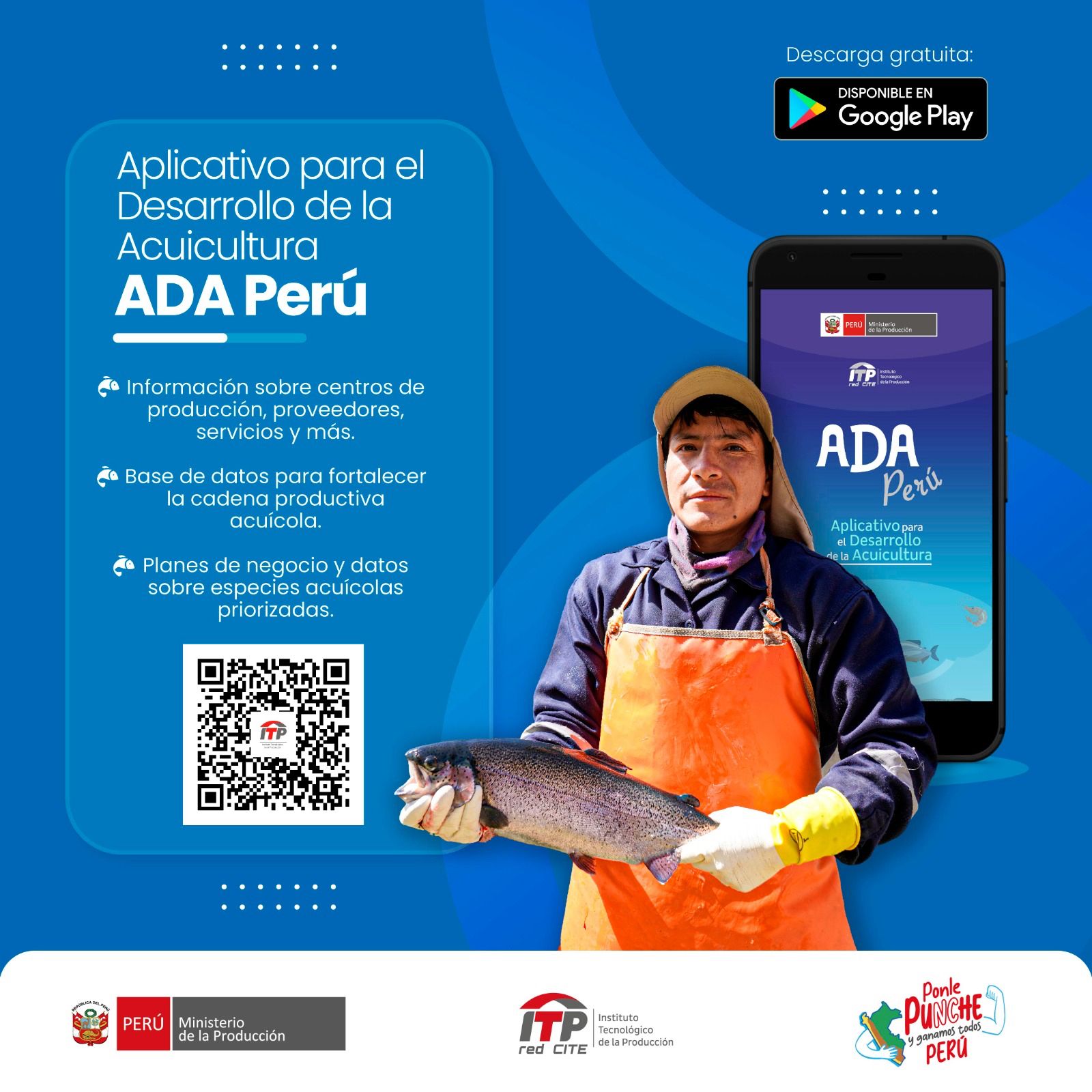 Nos dirigimos a usted para solicitar su valioso apoyo en la difusión del aplicativo ADA PERÚ, una herramienta digital gratuita desarrollada por el ITP con el objetivo de fortalecer el acceso a información clave para el desarrollo del sector acuícola. Este aplicativo permite conectar a empresas, profesionales, investigadores, técnicos y usuarios en general con oportunidades de capacitación, normativas actualizadas, investigaciones, eventos, y servicios tecnológicos especializados, además de poder visualizar centros de cultivo, especies priorizadas y proveedores a nivel nacional.