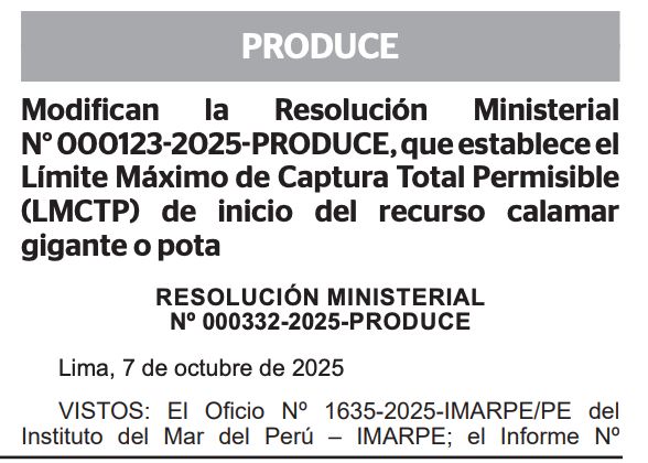 N° 000123-2025-PRODUCE, que establece el Límite Máximo de Captura Total Permisible (LMCTP) de inicio del recurso calamar gigante o pota