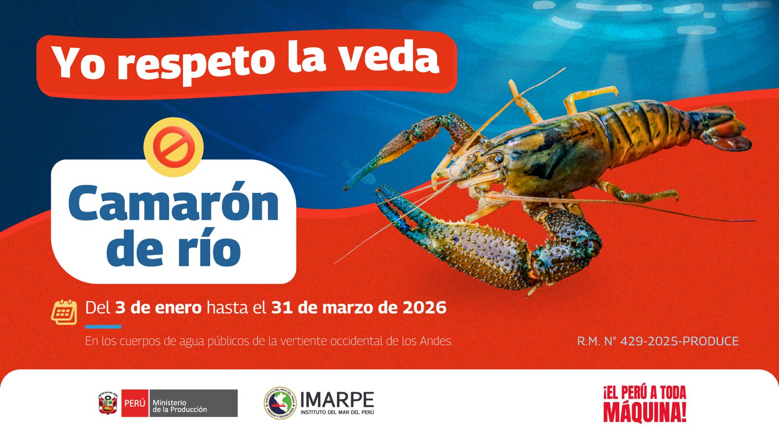 El Instituto del Mar del Perú – IMARPE informa que el recurso camarón de río (Macrobrachium caementarius) ingresó en periodo de veda reproductiva desde el 3 de enero al 31 de marzo de 2026, medida orientada a garantizar la sostenibilidad de esta especie de gran importancia social, económica y ambiental para el país.