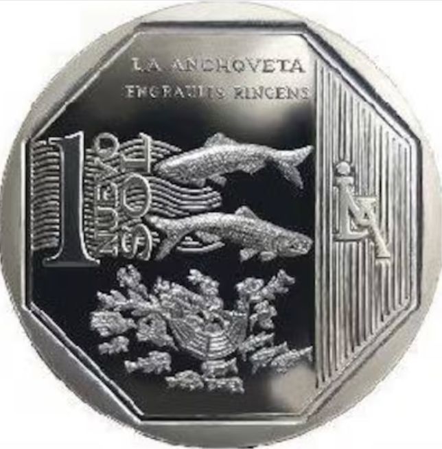 La moneda alusiva a la anchoveta tiene en la parte central del reverso la figura de dos peces de esta especie y debajo una representación de la cultura Moche. Se muestra la inscripción “La Anchoveta” y su nombre científico “Engraulis Ringens”.