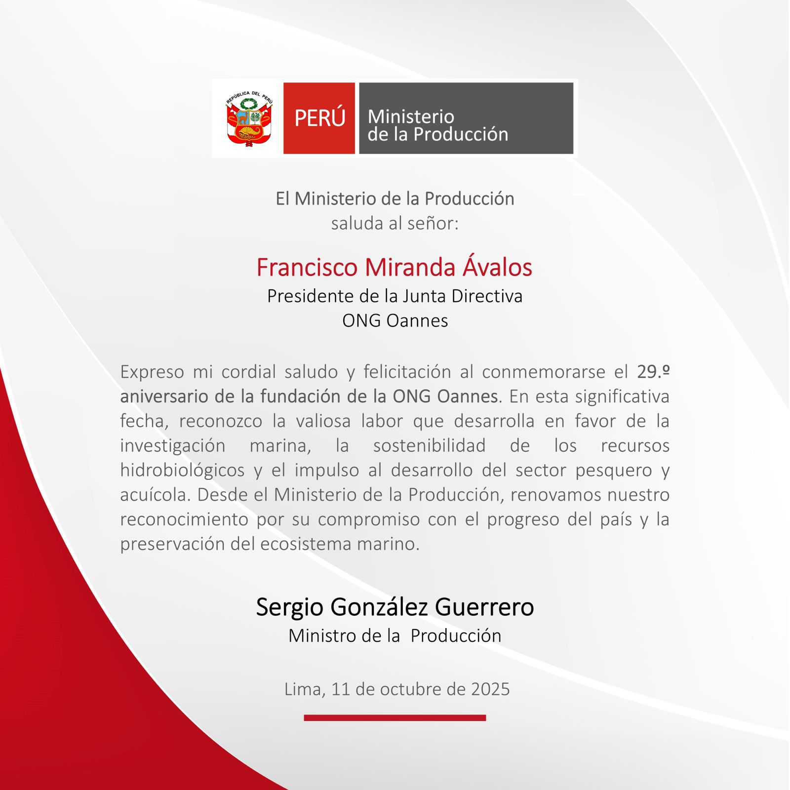 Perú - Oannes agradece saludos protocolares de PRODUCE por su aniversario 29
