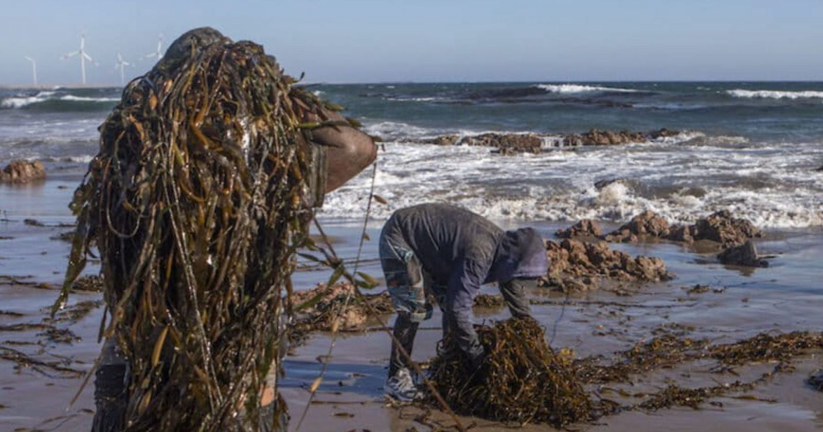 Al amanecer, camionetas y camiones irrumpen en el desierto por trochas casi invisibles que conectan la ciudad con las dunas, un recorrido de más de dos horas trazado en la arena por la costumbre. Al llegar a la playa, los choferes colocan una tabla de madera en la parte trasera del camión y, uno a uno, los pescadores suben por ella con montículos de algas sobre los hombros.