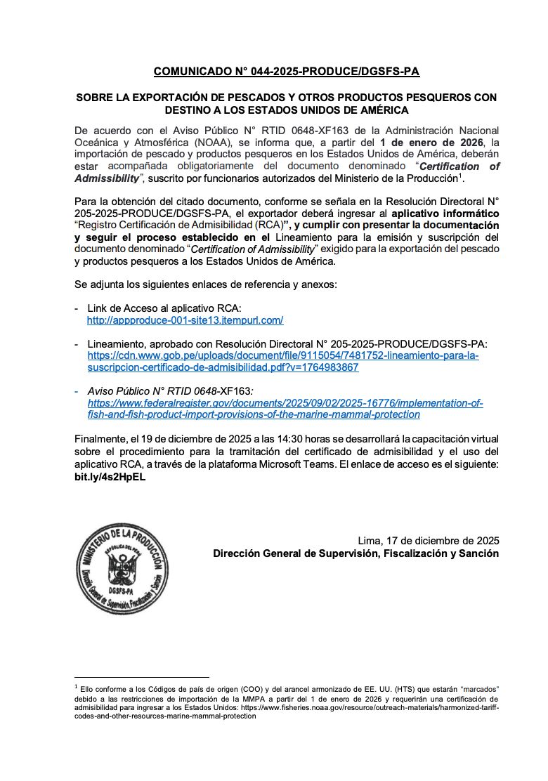 De acuerdo con el Aviso Público N° RTID 0648-XF163 de la Administración Nacional Oceánica y Atmosférica (NOAA), se informa que, a partir del 1 de enero de 2026, la importación de pescado y productos pesqueros en los Estados Unidos de América, deberán estar acompañada obligatoriamente del documento denominado “Certification of Admissibility”, suscrito por funcionarios autorizados del Ministerio de la Producción.